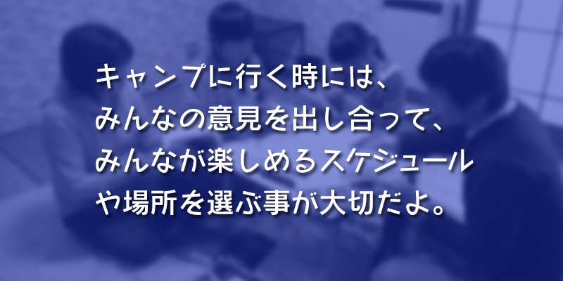 楽しいキャンプをするためには、前もってしっかりとしらべて、めんみつな計画をたて、