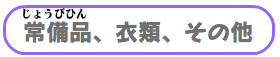 保険証(ほけんしょう)のコピー、常備薬(じょうびやく=救急(きゅうきゅう)セット、虫よけ、日焼けどめなど)、タオル、洗面道具、バンダナ、ティッシュ、トイレットペーパー