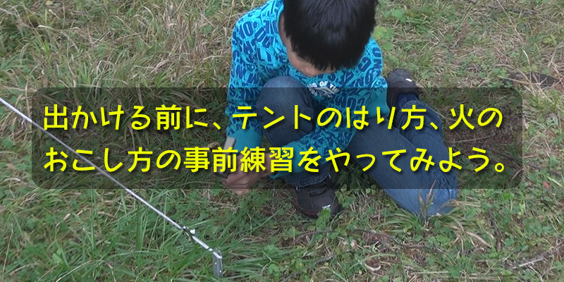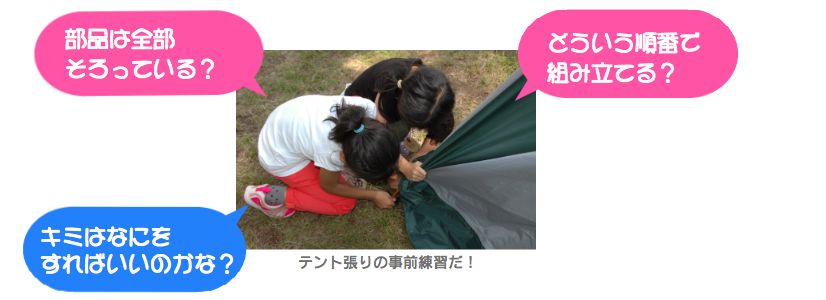 キャンプ地について、テントをはる段階になって困らないよう、しっかりと事前練習をしておこうね。