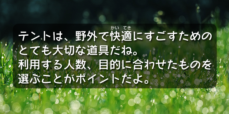 野外で泊(と)まる時に、一番重要なのがテントだね。