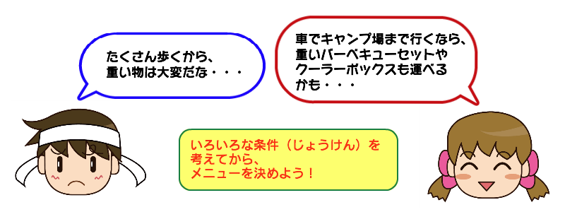 ・運ぶことを考えてコンパクトな物。移動があるときは重い物もさけようね。