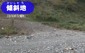 ・周りに危険(きけん)な所はないかな?木がたおれそうだったり、地面がぬかるんでいたり・・・。