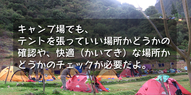テントをはるには、安全であるかだけではなく、他にも注意しなくてはならない事があるよ。何だと思う?