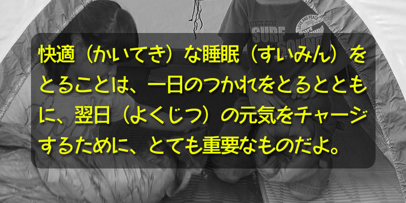 快適(かいてき)に眠(ねむ)るための準備(じゅんび)を整えても、せまいテントの中、なれない寝袋(ねぶくろ)ではなかなか熟睡(じゅくすい)できないかもしれないね。