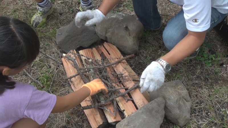 2.大きめの石を集めて、ならべる。その時、口は風上側になるようにする。