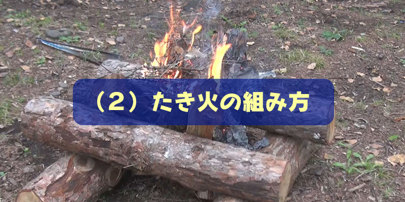 漢字の井の字のように、まきをくみ上げていって、まん中に着火用の小枝やスギの葉、新聞紙などを