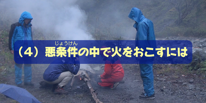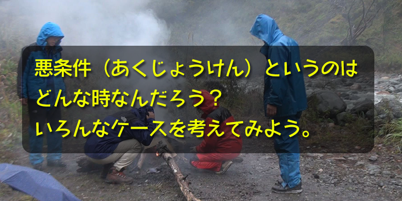 同じ悪条件と言っても、強風の場合は、思わぬ方向に飛び火して、テントを燃やしたり山火事の原因(げんいん)になる事もあるから、火をおこすのはひかえた方がいいね。やめる勇気も必要だよ。
