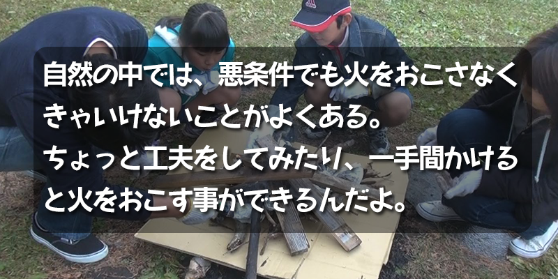 また、雨がふっていてもナイロンやビニールのカッパやポンチョをきたままで火おこしをするのは、絶対にダメだよ。