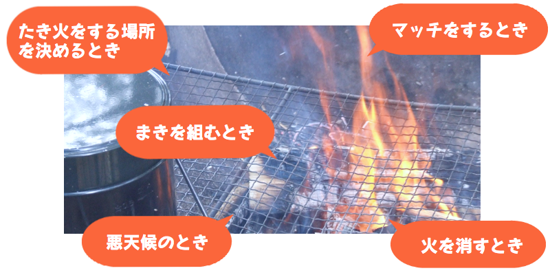 ・火を使うための安全の確認(かくにん)、どんな状況(じょうきょう)でも火が使えて、コントロールができること、それが“火を使いこなす”ということだよ。