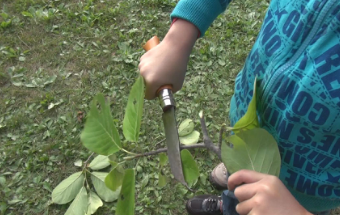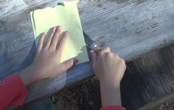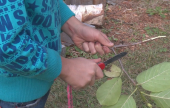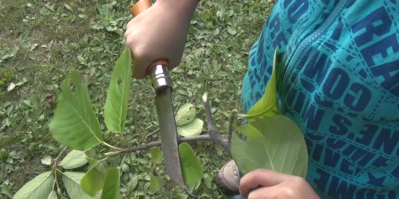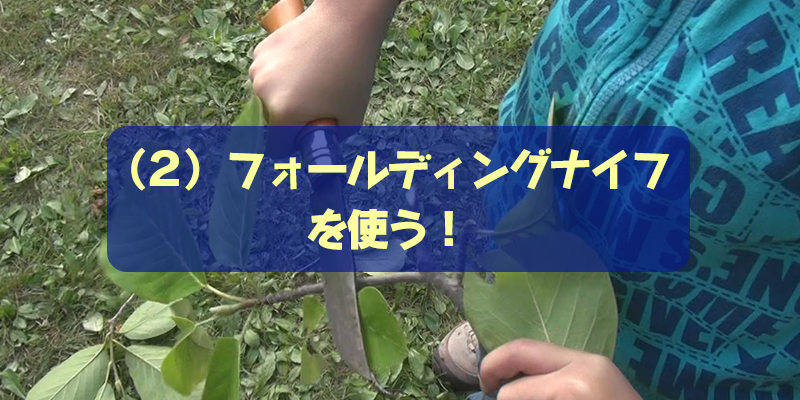 ナイフを手にしたら、まず小枝(こえだ)などを切ってみよう。近くに小枝がないような場合は、割りばしなどてもいいよ。