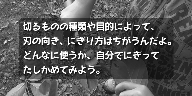 写真をみて、切るものによって、刃のむきや、にぎり方がちがって