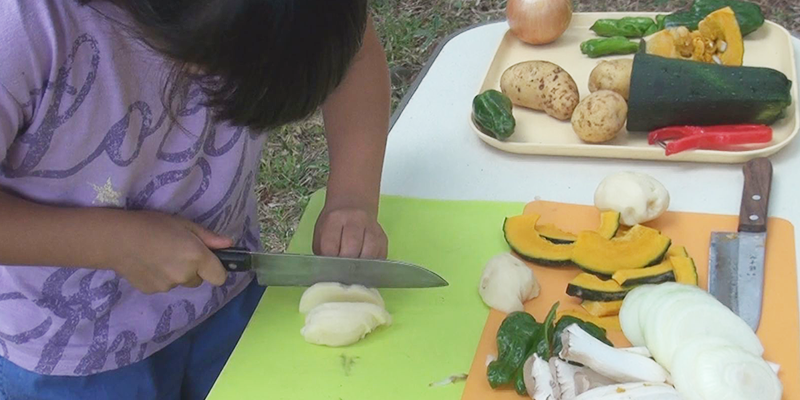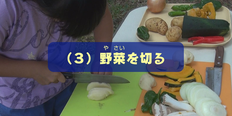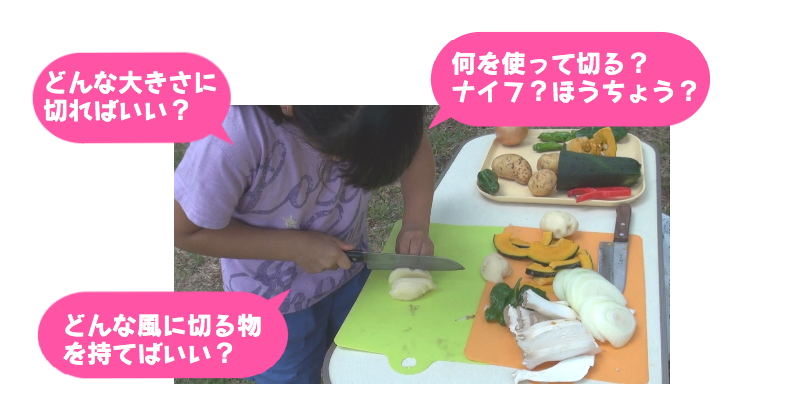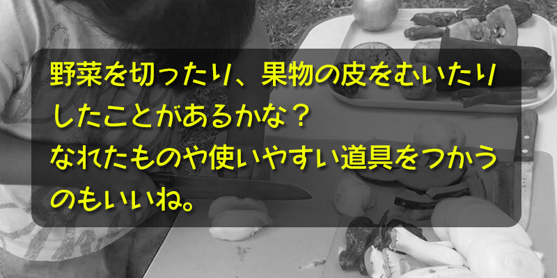 - お野菜(やさい)を切る時には、そのメニューにあわせて大きさや形をかえなくてはならないね。