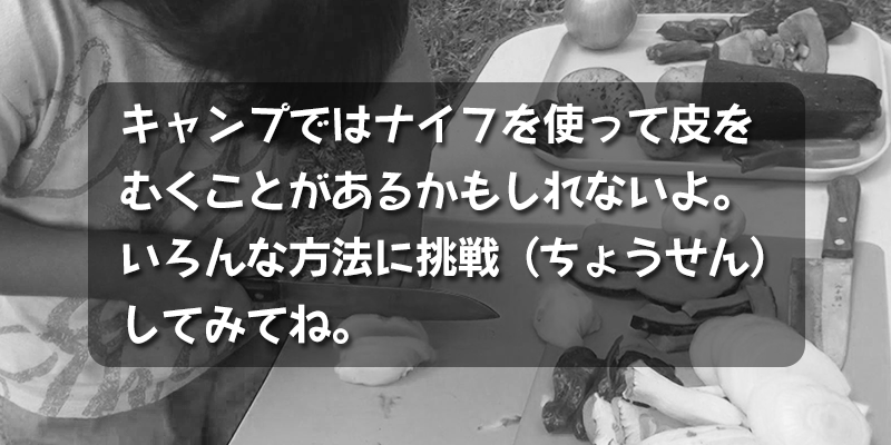 - お家の人に手伝ってもらってもいいんだけど、ナイフの刃を表面に直角にあてて、こすりとるように皮をとる方法もあるよ。