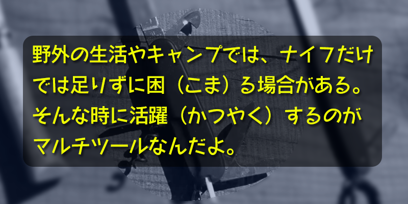 マルチツールは、野外で必要になるものを一つにまとめた、とても便利なものなんだ。