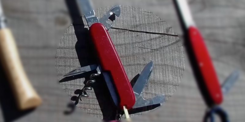 ナイフだけでなく、ドライバーやハサミ、せんぬき、かんきり、あなあけなどがついていて、それがコンパクトにおりたたんで収納(しゅうのう)できるように工夫されたものがマルチツールだよ。