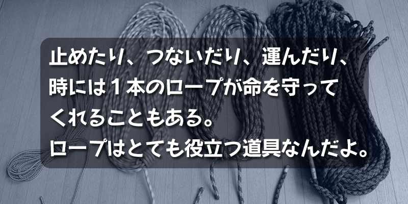 キャンプの時には、いろいろな場面でロープが必要になってくるよ。たとえば、ロープを使って、テントやツェルトを張(は)ったりすることができるね。万が一、サバイバルの必要な場合でも、ロープ1本で危険(きけん)をさける事もできるよ。