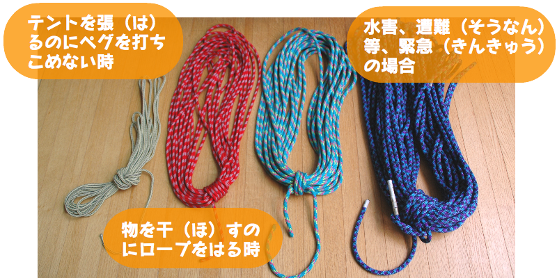 たとえば、ロープを使って、テントやツェルトを張(は)ったりすることができるね。